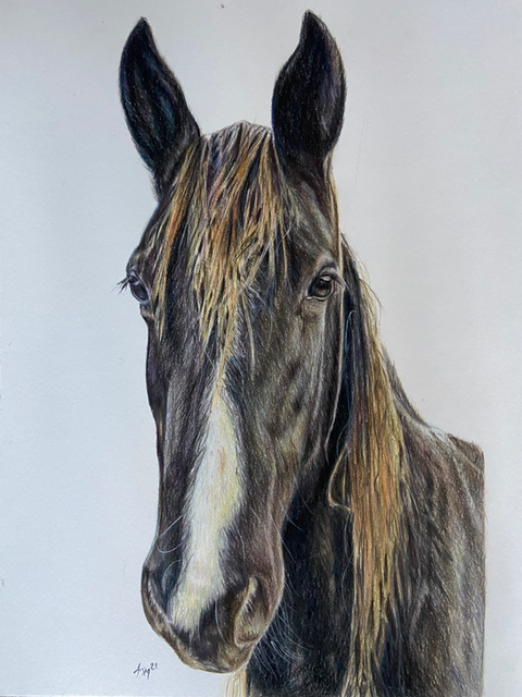 My husband commissioned Alice for a colour portrait of my horse Charlie who sadly passed away. Alice has captured the very soul of this beautiful boy in her work. His soft gentle eye and his quiet patient, trusting and contented countenance have been captured, in time, for ever more. Alice has managed in her work to feel and portray the special bond that I had with my sensitive horse. Every time I am drawn to look at his portrait, I can literally feel his velvety softness and warmth and get lost looking into his gentle eye. I can see into my special boys soul .......Thank you Alice for my “Charles Brown”